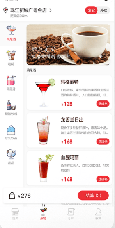小程序的點(diǎn)餐可分為“堂食”和“外賣”兩大類,展示方式比較醒目,其次還包含當(dāng)下酒吧正在熱賣的一些酒品簡介,方便用戶選擇。